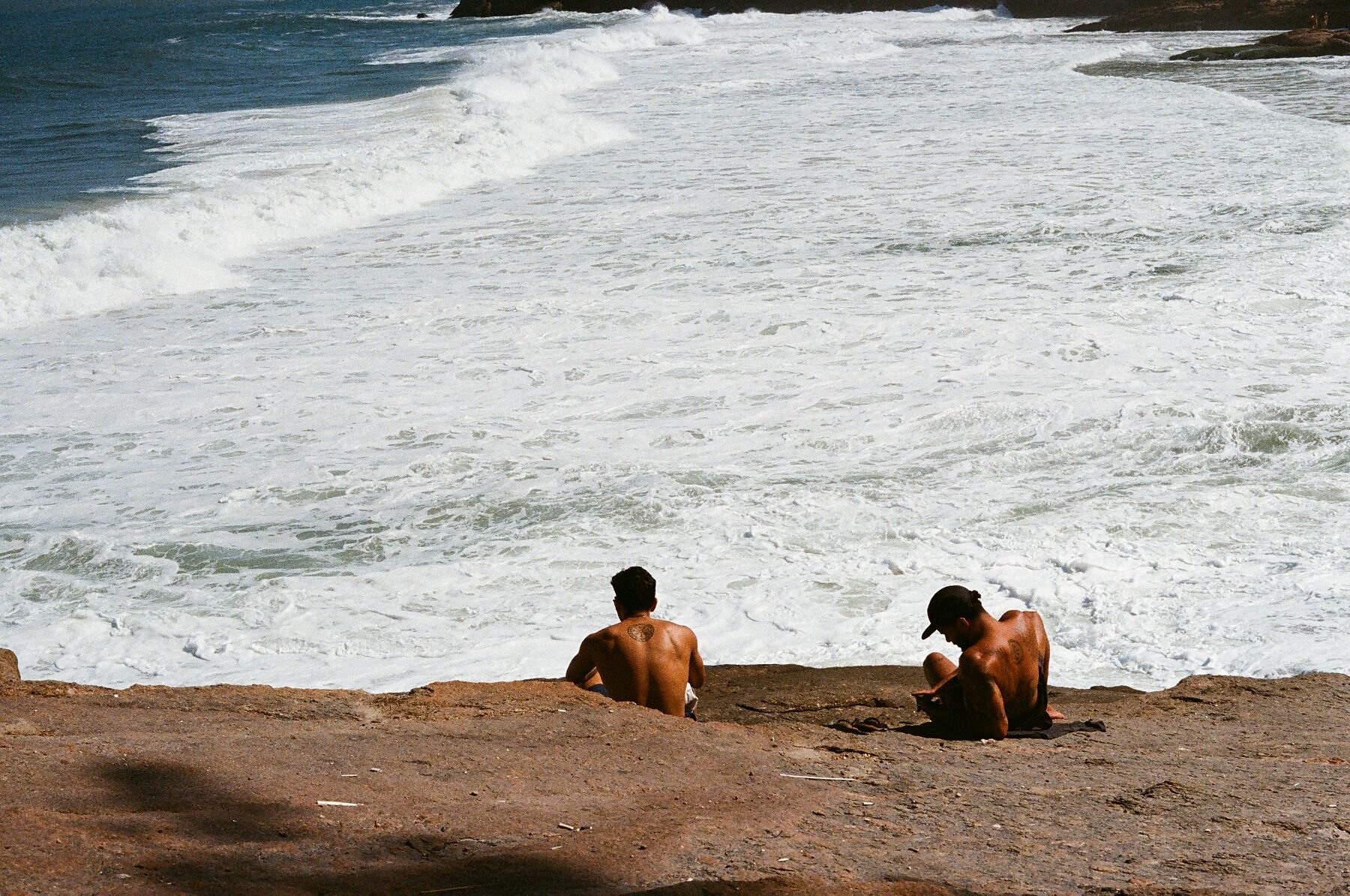 Two companions look out to sea from the cliffs of Joatinga Beach, Rio de Janeiro.